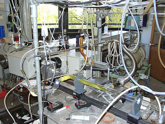 Die Erzeugung der Reaktanden, bzw. der Stoßpartner (Energieüberträger) erfolgt durch Mikrowellenentladungen, bzw. HV-Gleichspannungsentladungen in Seitenarmen des Strömungsrohres.