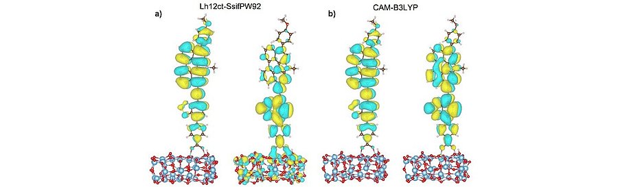 Evaluation of the performance of three different types of XC hybrid functionals, i.e. the global hybrid B3LYP, the range-separated hybrid CAM-B3LYP and the local hybrids Lh12ctSsifPW92 and Lh12ct-SsirPW92 for the excited state calculations and interfacial level alignments in combined dye@TiO2 systems and study of the charge-transfer mechanism at the dye-semiconductor interface by means of natural transition orbitals (NTOs).