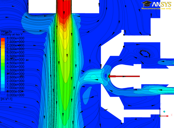 Um die Bewegung von Ionen in Atmosphärendruck Ionenquellen und ähnlichen Systemen beschreiben zu können, sind daher auch Modelle der Strömungsdynamik (Computational Fluid Dynamics - CFD) nötig. Einfachere Strömungsmodelle erstellen wir in unserer Arbeitsgruppe selbst, während wir für aufwendigere CFD-Rechnungen mit Partnern, wie beispielsweise dem Institut für Strahlantriebe und Turboarbeitsmaschinen der RWTH-Aachen, zusammenarbeiten.